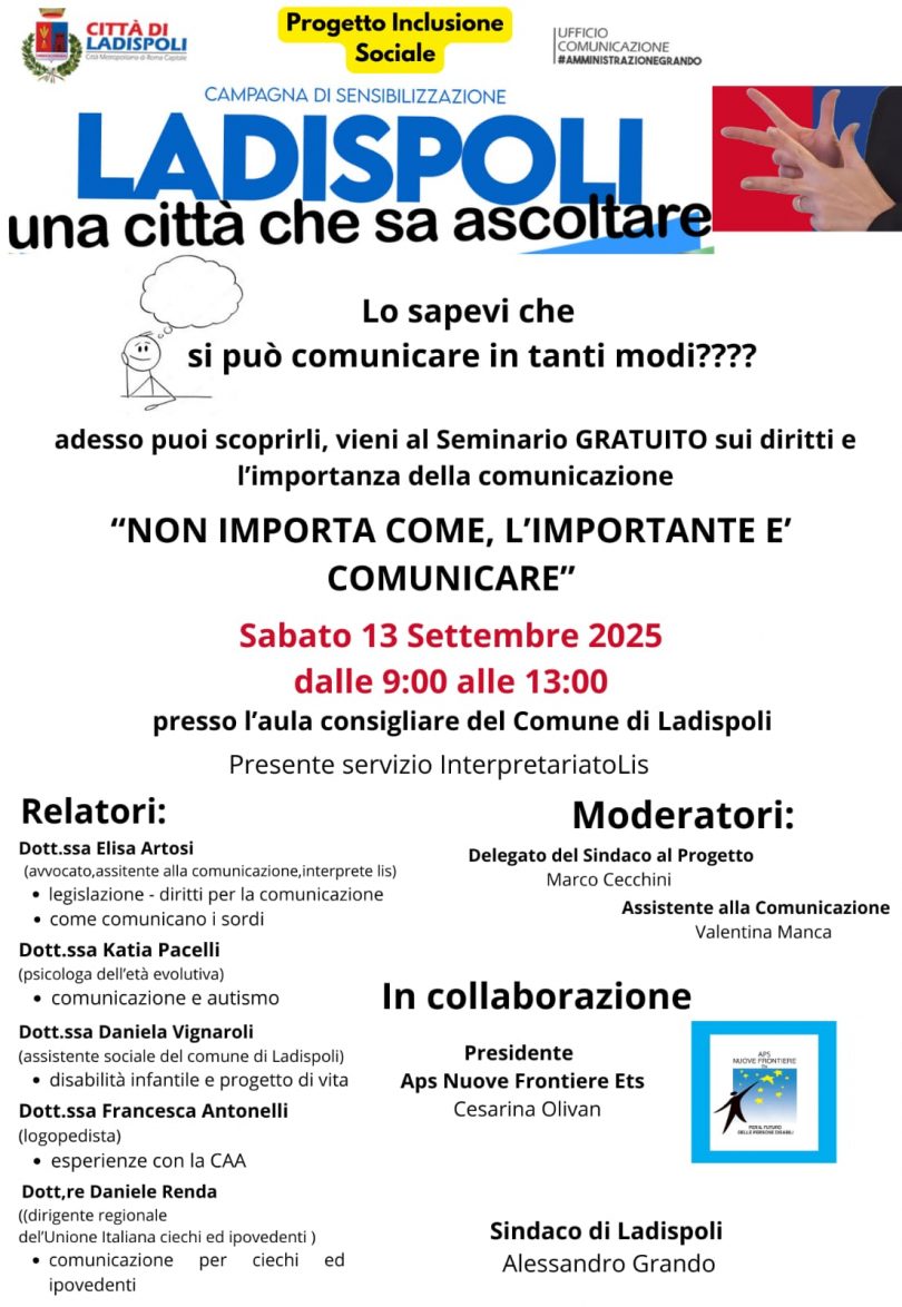 Marco Cecchini, delegato del Sindaco Alessandro Grando al progetto di inclusione sociale “Ladispoli Città che sta ad ascoltare”, insieme alla collaboratrice Valentina Manca, a tutto lo staff e con il supporto dell’Associazione APS Nuove Frontiere, invita la cittadinanza a partecipare al seminario gratuito: “Non importa come, l’importante è comunicare”. In programma sabato 13 settembre alle ore 9,00 nella sala consiliare del Comune di Ladispoli in piazza Falcone.Un incontro dedicato alla riflessione sul valore e sulle diverse forme della comunicazione.