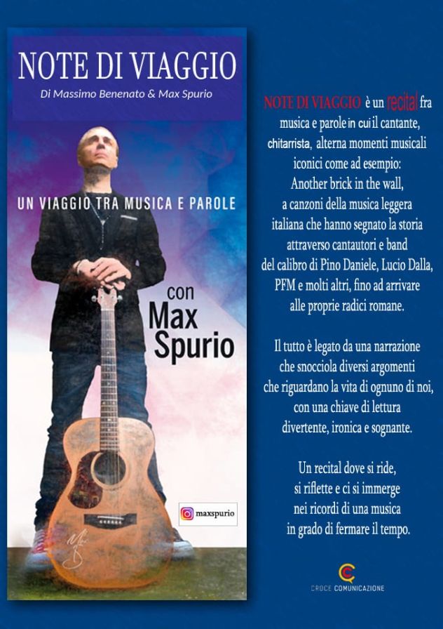 Chitarrista, cantante, autore di libri – tra gli altri “La via dei pensieri” e “Tracce” –  Max Spurio ha fatto parte dei Future (terzo posto al Festival di Sanremo nel 1987 per le “nuove proposte”) e ha al suo attivo moltissimi concerti in Italia e all’estero. Con questo spettacolo entra nei teatri per proporre la sua narrazione a tratti ironica, a tratti profonda.