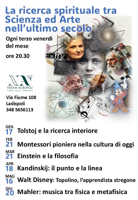 Nuova Acropoli accoglie il 2025 a Ladispoli con il ciclo di conferenze “La ricerca spirituale tra Scienza ed Arte nell’ultimo secolo”, con appuntamento ogni terzo venerdì del mese alle ore 20:30 in via Fiume 108 a Ladispoli, a partire dal 17 gennaio e fino al 20 giugno.La spiritualità è solo appannaggio delle religioni? Il 1800, positivista e scientista, ha dimostrato, quasi paradossalmente, che la spiritualità è propria dell’Uomo. Il “secolo delle inquietudini” ha di fatto inaugurato una avvincente ricerca, ancora in atto, per la comprensione della parte invisibile del cosmo, generando profonde rivoluzioni nei campi dell’Arte e della Scienza, tema appunto del ciclo di incontri. Il primo appuntamento (17/01) sarà dedicato a Tolstoj, scrittore filosofo e perfino ispiratore di Mahatma Gandhi. Vedremo poi la figura di Maria Montessori (21/02) e il suo metodo pedagogico conosciuto e apprezzato in tutto il mondo, e proseguiremo il 21/03 con la filosofia sottesa agli studi di Albert Einstein. Con Kandinskij scopriremo la natura metafisica del punto e della linea. (18/04) mentre Walt Disney ci parlerà attraverso il suo personaggio più famoso, Topolino, nelle vesti dell’”Apprendista Stregone” (16/05). Chiude il ciclo, nella Giornata Internazionale delle Arti (20/06), la musica di Mahler: un viaggio tra fisica e metafisica Un ciclo di conferenze che vuole offrire un punto di vista spirituale e maturo al ruolo dell’Arte e della Scienza nella nostra quotidianità, dato che l’Arte non è solo evocare emozioni o espressioni soggettive, né la Scienza mero progresso tecnologico e crescita intellettuale. Le conferenze, come è nello stile di Nuova Acropoli, avranno una natura laboratoriale, in parte teatralizzate, per rendere pratica ed utile la fruizione anche ad un pubblico giovane e non di settore. Per informazioni e prenotazioni, è possibile contattare il 348 5656113 o scrivere a ladispoli@nuovaacropoli.it