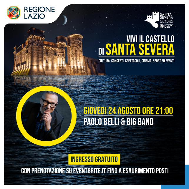 Paolo Belli e la sua Big Band  arriva al Castello di Santa Severa con un concerto previsto per giovedì 24 agosto alle 21.00 che si inserisce nel cartellone degli eventi in programma per “Vivi il Castello di Santa Severa“, rassegna promossa dalla Regione LazioAssessorato alla Cultura e organizzata dalla società in house LAZIOcrea in collaborazione con ATCL – Circuito Multidisciplinare del Lazio.