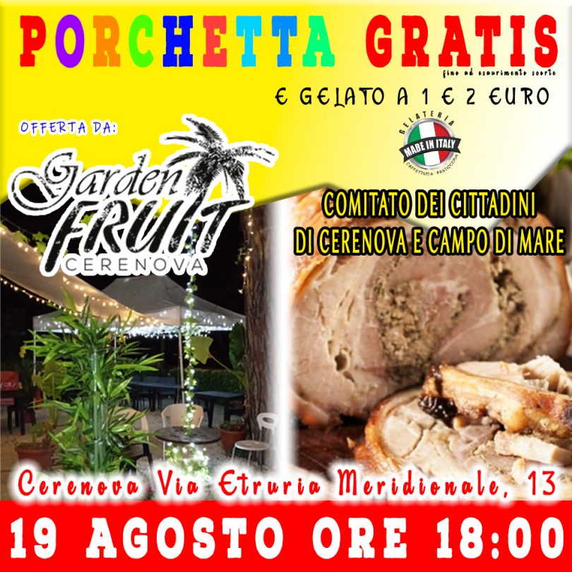 Il Comitato dei Cittadini di Cerenova e Campo di Mare, per ringraziare le tantissime persone che hanno firmato la nostra petizione contro il degrado, insieme al Bar GARDEN FRUIT, vi invita a partecipare alla porchettata offerta gratuitamente. Questo è un modo per continuare a fare rete tra residenti e non, della frazione.