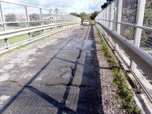 Tanto da allarmare i residenti della zona rurale e gli automobilisti di passaggio. Accade tra via dell’Infernaccio e via Aviatina dove con il trascorrere del tempo il manto stradale del ponte è diventato un percorso di guerra costellato da buche e voragini. Le recenti piogge hanno aggravato la situazione del manto stradale, le pozzanghere nascondono micidiali trabocchetti per i veicoli ed un serio pericolo per motociclette e scooter che rischiano di essere inghiottiti dai crateri.