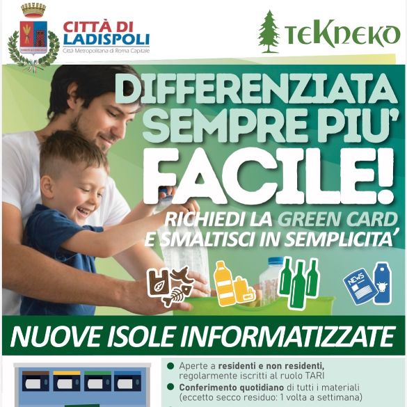 Le isole informatizzate integrano il servizio porta a porta e sono a disposizione di tutte le utenze domestiche regolarmente iscritte a ruolo TARI nel Comune di Ladispoli.  L’accesso avviene tramite Green Card personale e registrata, ritirabile presso lo sportello Tekneko. Sono installate : Zona Miami: Viale Europa Zona Palo Laziale: Largo Botticelli.