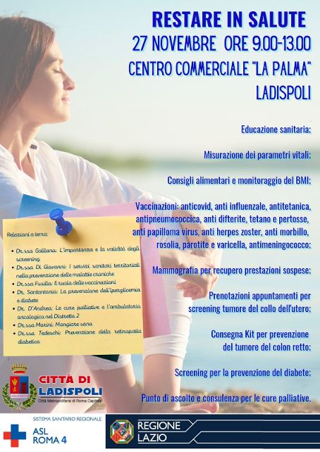 Con queste parole il delegato alla sanità, Pasquale Raia ha annunciato l’iniziativa “Restare in salute” che si svolgerà sabato 27 novembre presso il centro commerciale “La Palma” in piazza Falcone a Ladispoli.