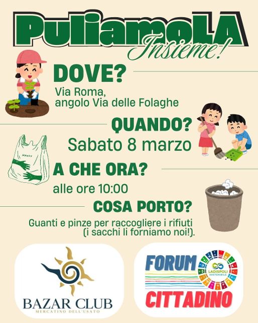 I cittadini di Ladispoli si rimboccano le maniche per provvedere alla pulizia delle zone più colpite dagli incivili. Sabato 8 marzo, a partire dalle ore 10, il Bazar Club ha convocato tutti alle ore 10 in via Roma, angolo via delle Folaghe, per invitare le persone ad armarsi di guanti, rastrelli, sacchi della spazzatura e pinze al fine di raccogliere tutti i rifiuti abbandonati nel verde e sui marciapiedi. Un’iniziativa non nuova da parte del Bazar Club per spronare la popolazione a collaborare con le istituzioni per tenere pulita Ladispoli.