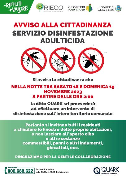 Il Comune di Cerveteri ha programmato un nuovo intervento di disinfestazione anti-zanzare in tutto il territorio comunale. Ad effettuarlo, la ditta Quark srl, che nella notte tra sabato 18 e domenica 19 novembre, a partire dalle ore 02:00 di notte, provvederà ad effettuare un interventi nell’intero territorio comunale. Il trattamento si concluderà alle prime ore del mattino seguente.Come di consueto, si invita la cittadinanza a chiudere le finestre delle proprie abitazioni, a non lasciare cibo e altre sostanze commestibili all’aperto e porre al riparo panni, indumenti, giocattoli e animali d’affezione. “L’intervento di disinfestazione contro le zanzare avverrà tutto in una notte e nell’intero territorio comunale – ha dichiarato il Sindaco di Cerveteri Elena Gubetti – come al solito, ci tengo a chiarire un aspetto importantissimo: il trattamento interessa solamente le aree pubbliche e solamente di riflesso va a colpire le zone private, quali giardini o balconi. Invito pertanto la cittadinanza, a rimuovere eventuali ristagni d’acqua presenti nei terrazzi, come ad esempio quelli che si possono creare nei sottovasi delle piante, in quanto potrebbero aumentare il proliferare di zanzare. È fondamentale quindi, per ottimizzare gli effetti, la collaborazione di tutti i cittadini. Giardini o spazi esterni poco curati possono indebolire, anche sensibilmente, l’efficacia degli interventi effettuati”. “L’intervento – conclude il Sindaco Gubetti – verrà effettuato tutto in una notte. Si precisa che saranno utilizzati solo prodotti regolarmente autorizzati dal Ministero della Salute”.