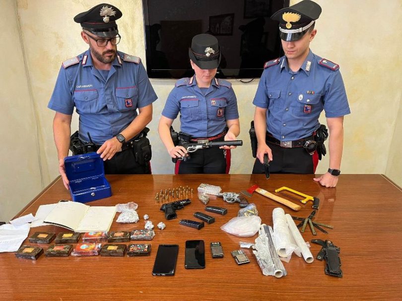 Nello specifico, nel corso di un servizio di osservazione antidroga i Carabinieri hanno sorpreso e arrestato una donna romana di 59 anni, gravemente indiziata dei reati di detenzione ai fini di spaccio di sostanze stupefacenti e detenzione clandestina di armi e relativo munizionamento. La 59enne domiciliata in un appartamento a Ostia, è stata trovata in possesso di un arsenale di armi e droga, nello specifico: una pistola calibro 9 con matricola abrasa, una pistola calibro 9 con silenziatore inserito e matricola abrasa, una pistola revolver con matricola ribattuta, tre caricatori con 6 proiettili calibro 380 e 83 proiettili di vario calibro, oltre a 10 panetti di hashish, dal peso complessivo di 1 kg e 53 involucri della medesima sostanza. Scattate le manette la donna è stata condotta presso il carcere femminile di Roma Rebibbia.
