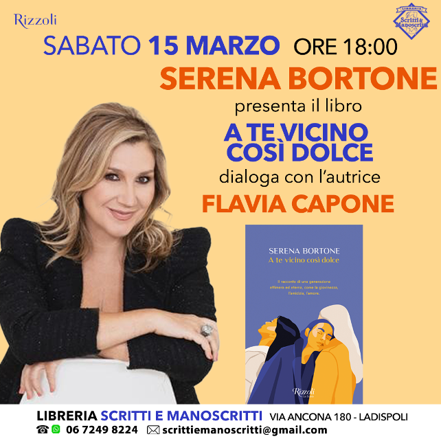 Sabato 15 marzo alle ore 18:00 Serena Bortone presenta il libro “A te vicino così dolce” pubblicato da Rizzoli Editore.Dialoga con l’autrice Flavia Capone. A te vicino così dolce è un romanzo tenero e avvincente, ma anche doloroso e pieno di coraggio, su quanto siamo disposti a farci ingannare dall’amore. Serena Bortone racconta con una prosa graffiante e fresca una stagione della vita in cui i sentimenti sembrano prevalere su tutto, trascinandoci in un vortice oscillante tra illusione e bruschi ritorni alla realtà. E ci consegna il ritratto di una generazione che scopre di non essere mai stata così libera come le hanno fatto credere. Serena Bortone è una giornalista e autrice. Ha iniziato a lavorare sotto la direzione di Angelo Guglielmi, ed è stata poi caporedattrice, inviata, autrice e conduttrice per diversi programmi della rete (da Ultimo Minuto a Mi manda Raitre, da Telecamere a Tatami) occupandosi di cronaca, costume, inchieste e soprattutto di politica. Nel 2007 ha guidato come responsabile comunicazione e ufficio stampa la campagna per le Primarie del Partito Democratico.