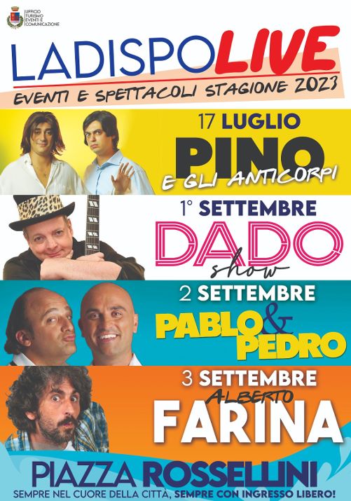 “Ad aprire Ladispolive – ha proseguito Porro – “Pino e gli Anticorpi”. Il duo, direttamente da Colorado Cafè, si esibirà il 17 luglio. Un altro tris esplosivo invece concluderà la stagione estiva. Il primo weekend di settembre, infatti, sarà dedicato alla comicità irriverente di Dado, Pablo & Pedro e Alberto Farina, rispettivamente 1, 2 e 3 settembre. Tutti gli spettacoli si svolgeranno in Piazza Rossellini e sempre con ingresso libero e senza prenotazione. Il calendario degli eventi si sta continuando a definire per regalare a tutti un’altra bellissima estate da trascorrere a Ladispoli”.