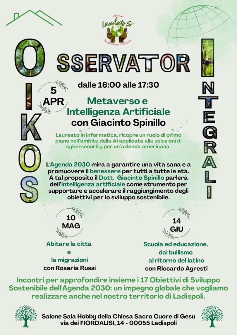 Il Circolo Laudato Si’ Sacro Cuore di Ladispoli è lieto di annunciare un incontro speciale dal titolo “Intelligenza Artificiale e Metaverso”, che si terrà il 5 aprile alle ore 16:00 presso la parrocchia Sacro Cuore di Gesù, situata in via dei Fiordalisi n.14. Questo evento fa parte del ciclo di incontri “Osservatori Integrali dell’Oikos”, che mira a connettere gli obiettivi dell’Agenda 2030 con la realtà sociale del territorio.Durante l’incontro, il relatore Giacinto Spinillo, esperto di intelligenza artificiale applicata alla cybersecurity, esplorerà come il Metaverso e l’IA possano influenzare la vita quotidiana di tutti i cittadini. Spinillo, laureato in Informatica e con una carriera che include esperienze presso i Bell Labs negli Stati Uniti, condividerà la sua visione su come queste tecnologie possano diventare strumenti supporto per la lotta al cambiamento climatico, ricordando sempre che “È fondamentale utilizzare queste tecnologie con discernimento, per non perdere il contatto con la realtà e la comunità”.