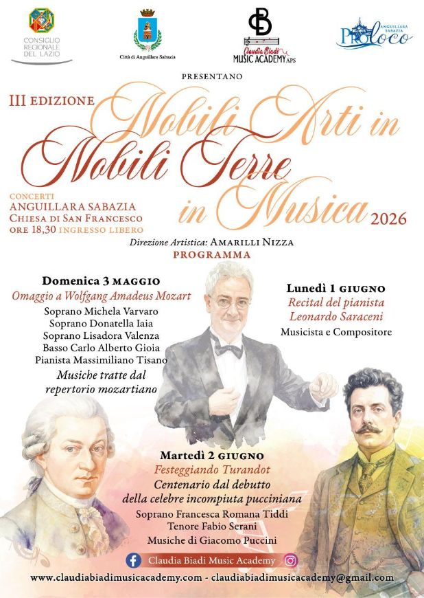 Tre date per la terza edizione di “Nobili Arti in Nobili Terre in Musica” la stagione di primavera realizzata ad Anguillara da Comune di Anguillara per la direzione artistica del soprano di fama internazionale Amarilli Nizza, in collaborazione con la Claudia Biadi Music Academy e la Pro Loco Anguillara e il contributo della Presidenza del Consiglio regionale del Lazio. Un evento musicale che porta sul lago di Bracciano con incontri ad ingresso libero grandi interpreti. La manifestazione si consolida e anche quest’anno si ispira a importanti centenari, come quello della prima di Turandot del genio Giacomo Puccini proponendo allo stesso tempo nuove musiche e nuovi interpreti come il pianista e compositore Leonardo Saraceni che chiuderà la kermesse. I concerti lirici saranno accompagnati dal pianista Massimiliano Tisano, vicepresidente della Claudia Biadi Music Academy.