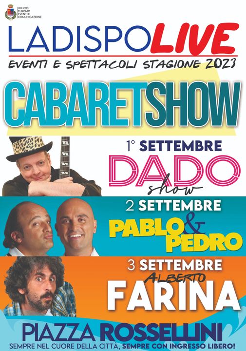 A Ladispoli il primo fine settimana di settembre è all’insegna dell’allegria e della comicità. Venerdì 1 settembre è la volta di Dado,  comico versatile e originale, al secolo Gabriele Pellegrini. Sabato 2 settembre a salire sul palco, allestito in piazza Rossellini, il duo cabarettistico Pablo & Pedro, al secolo Nico Di Renzo e Fabrizio Nardi, che dal 1994, anno in cui sono stati lanciati nel mondo dello spettacolo, non si sono più fermati.